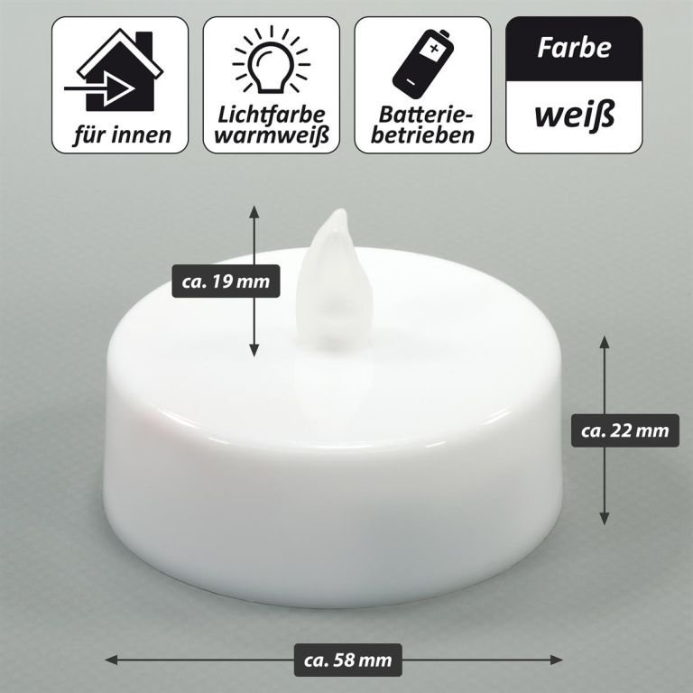 Vďaka batérii ste nezávislí na zásuvkách. Pomocou funkcie časovača si môžete nastaviť dobu svietenia podľa vášho priania (6 hodín zapnuté / 18 hodín vypnuté). Pretože sa tieto bezplamenné čajové sviečky nezahrievajú, je možné ich pokojne používať v blízkosti látok alebo v detskej izbe a nepredstavujú nebezpečenstvo požiaru. Ideálna pre príjemné chvíle v obývacej izbe alebo pre útulnú atmosféru v reštaurácii a kaviarni. Všimnite si aj naše ďalšie svietidlá, ako sú rozprávkové svetlá, voskové sviečky, osvetlenie vianočných stromčekov a ďalšie vianočné dekorácie.