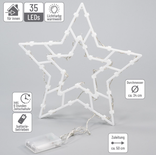 Dekoratívna sada 2 okenných obrázkov skladajúci sa z vianočného stromčeka a hviezdy, každý s 35 teplými bielymi diódami, 60 cm prívodným káblom. Vďaka praktickému prísavnému držiaku je možné okennú dekoráciu využiť mnohými spôsobmi, či už na okná, dvere alebo steny - vianočné dekorácie, ktoré vykúzlia vo vašom byte sviatočnú atmosféru. Prevádzka na batérie znamená, že ste nezávislí na zásuvkách, takže motívy je možné umiestniť kdekoľvek. Vhodné iba pre interiéry, trieda ochrany IP20 zaručuje bezpečnosť. Energeticky úsporných 35 LED na motív zaisťuje nízku spotrebu energie. Doplňte svoju vianočnú výzdobu o ďalšie skvelé zimné, vianočné a letné svetelné dekorácie ako sú rozprávkové svetielka, svetelné stromčeky, svetelné siete, svetelné závesy, gule, hviezdy, soby, lucerny a sviečky z nášho sortimentu.
