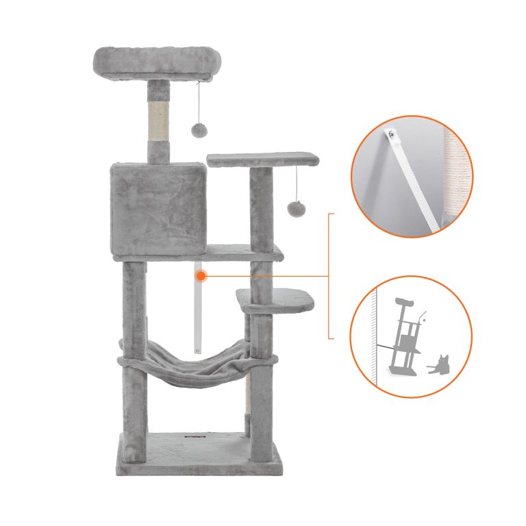 Škrabadlo pre mačky s domčekom a hojdacou sieťou, svetlošedé