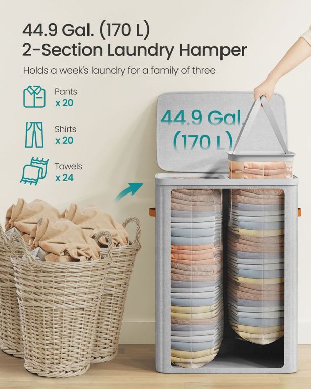 SONGMICS Kôš na bielizeň je ideálnym riešením pre každú domácnosť. Vďaka dvom samostatným priehradkám s označením "Svetlé" a "Tmavé" rýchlo roztriedite bielizeň a zjednodušíte si pranie. Kôš má kapacitu 170 litrov, čo vystačí na týždennú dávku bielizne pre rodinu až troch osôb. Vďaka praktickému veku a odnímateľným taškám zostane bielizeň chránená a vaša domácnosť uprataná.