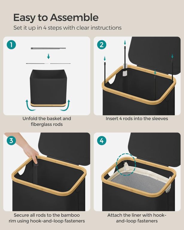 Urobte si poriadok v domácnosti s priestranným košom na bielizeň SONGMICS s objemom 90 litrov. Moderný dizajn v čiernej farbe, doplnený bambusovými úchytmi a praktickým vekom, skvele zapadne do každého interiéru. Vyberateľná sieťovaná vložka vám uľahčí manipuláciu aj pranie a vďaka skladacej konštrukcii kôš ľahko upratáte, keď ho práve nepotrebujete.