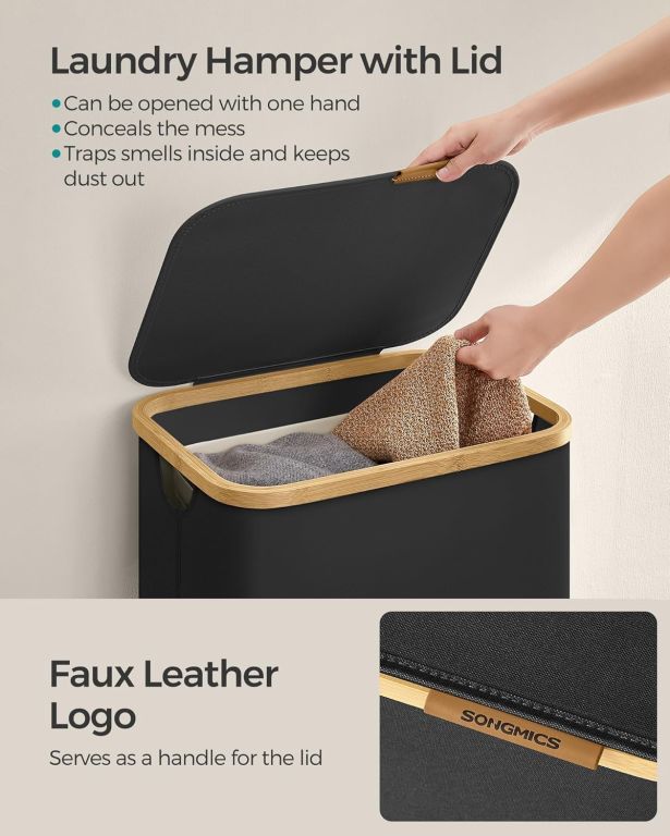Štýlový 90L kôš na bielizeň SONGMICS s vekom, bambusovými úchytmi a vyberateľnou vložkou uľahčí každodenné triedenie aj pranie.