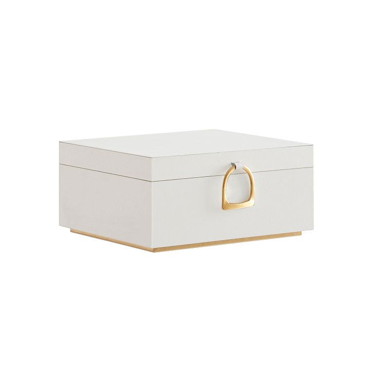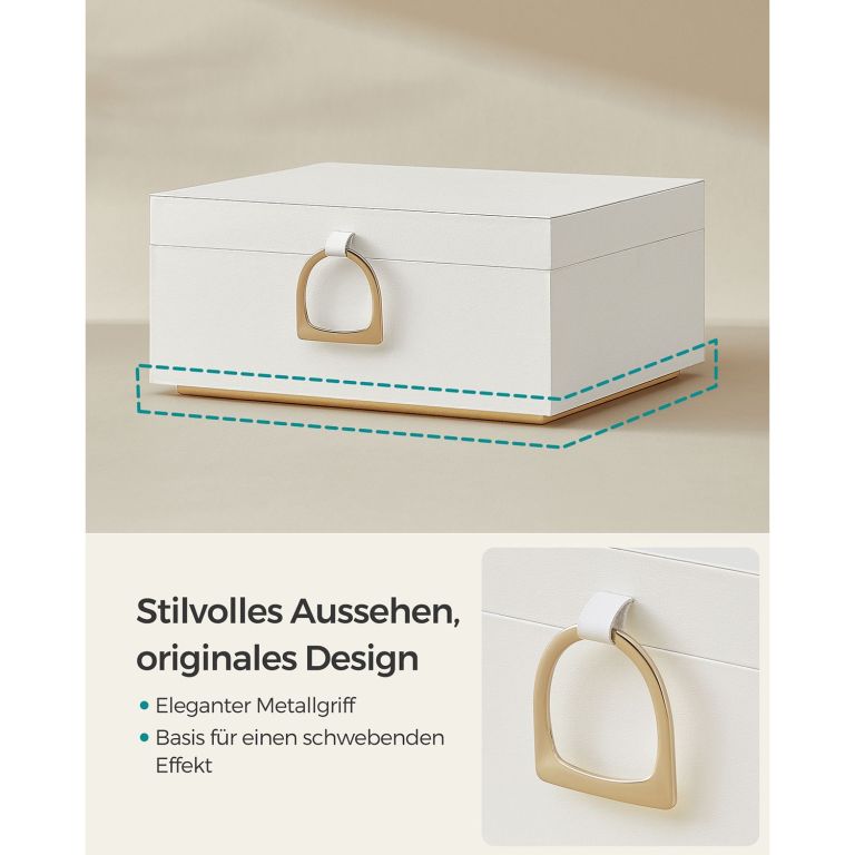 Túžite po tom, aby mali vaše šperky, hodinky aj drobné doplnky svoje vlastné miesto? Táto štýlová šperkovnica SONGMICS vás očarí originálnym dizajnom v bielo-zlatom prevedení, ktorý pôsobí luxusne a nadčasovo. Praktická vyberateľná priehradka, elegantný kovový úchyt a efekt plávajúcej základne dodávajú celej krabičke jedinečný vzhľad, ktorý sa hodí do každého interiéru.