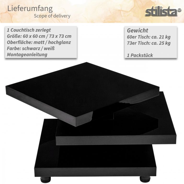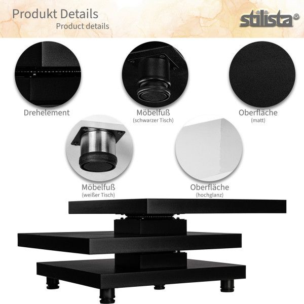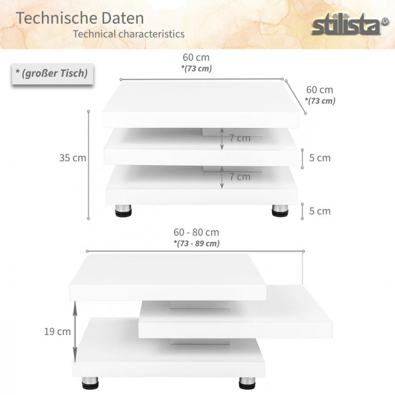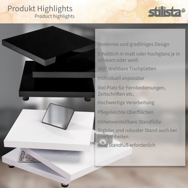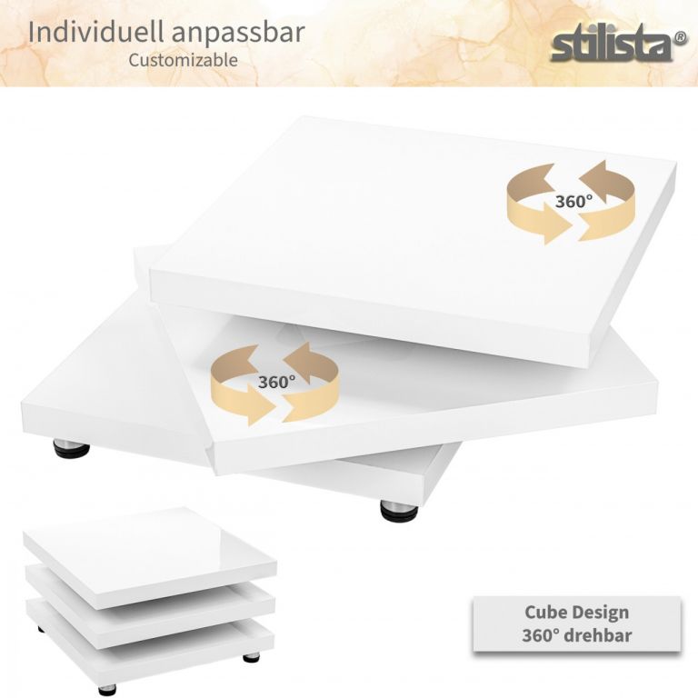 Tento konferenčný stolík je skutočným vrcholom Vášho domova a zaujme svojim dizajnom a kvalitou. Dve horné stolové dosky je možné otočiť o 360 °, takže si stolík môžete upraviť podľa seba a Vášho priestoru. Má nastaviteľné nôžky s chráničmi podlahy. Úložný priestor odkladacieho stolíka medzi doskami je ideálny na uloženie časopisov, diaľkových ovládačov a mnoho ďalšieho.