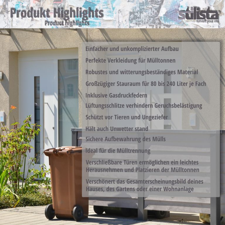 Ponúka priestor pre štyri koše s objemom až 240 litrov. Veko boxu na odpadky má plynovú tlakovú pružinu pre ľahké otváranie a zatváranie.