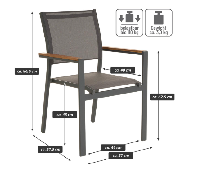 Stoličky sú vyrobené z kvalitného hliníka s práškovým nástrekom, čo zaručuje dlhú životnosť a jednoduchú údržbu. Ľahká konštrukcia umožňuje jednoduché prenášanie a stohovanie, čím šetríte miesto pri skladovaní. Povrch Teslin je odolný voči poveternostným vplyvom a ľahko sa čistí, čo oceníte pri každodennom používaní.