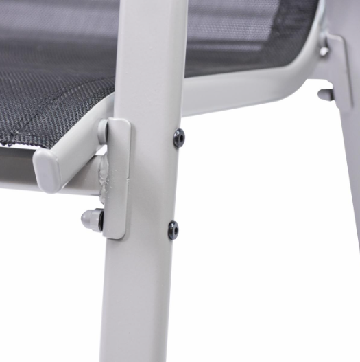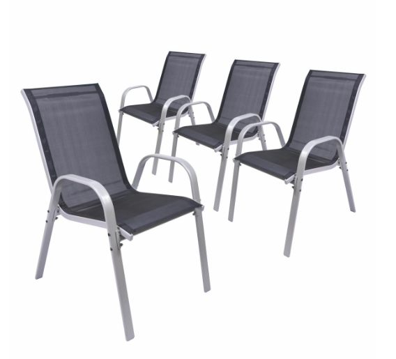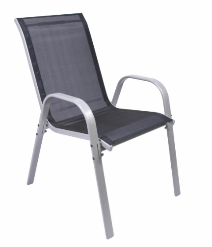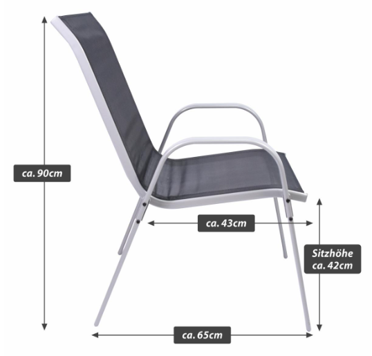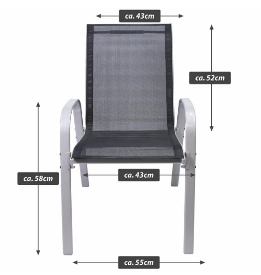 Tieto robustné stoličky kombinujú stohovateľný oceľový rám s čiernym textilným poťahom – materiály, ktoré sú odolné voči poveternostným vplyvom a ľahko sa udržiavajú. S rozmermi 90 × 55 × 65 cm a výškou sedadla 42 cm poskytujú pevné a pohodlné sedenie. Dajú sa perfektne stohovať a šetria miesto, čo je ideálne pre praktické použitie v záhrade aj doma.