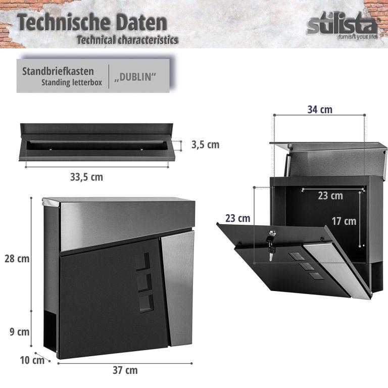 Nástenná poštová schránka radu Stilista v modernom dizajne ponúka dostatok úložného priestoru pre Vaše listy a pohľadnice. Schránka má veľký otvor na listy a je teda vhodná aj pre veľké listy a silnejšie obálky. Sú tak chránené pred poveternostnými vplyvmi. Vďaka dodávanému montážnemu materiálu schránku zostavíte rýchlo a ľahko. Vďaka dvom nohám môžete schránku umiestniť samostatne a nepotrebujete stenu na montáž.