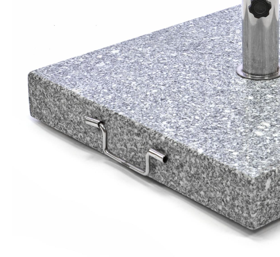 Stabilný a elegantný stojan na slnečník s priemerom do 4 metrov z leštenej žuly v kombinácii s nerezovou oceľou. Zapustené kolesá na spodnej časti a rukoväť z nerezovej ocele pre ľahkú prepravu. Dodáva sa s 2 plastovými objímkami s vnútorným priemerom 39 a 50 mm pre uchytenie slnečníka.