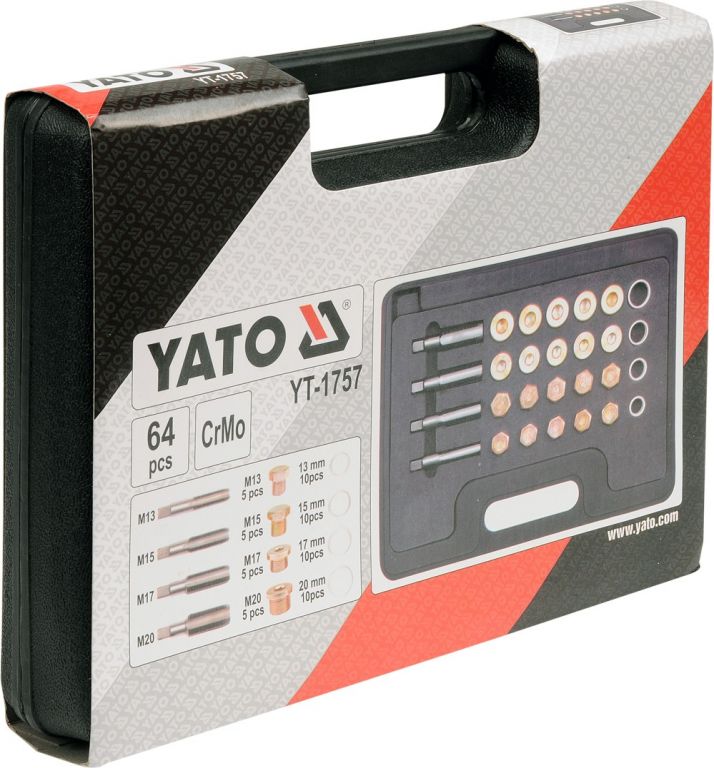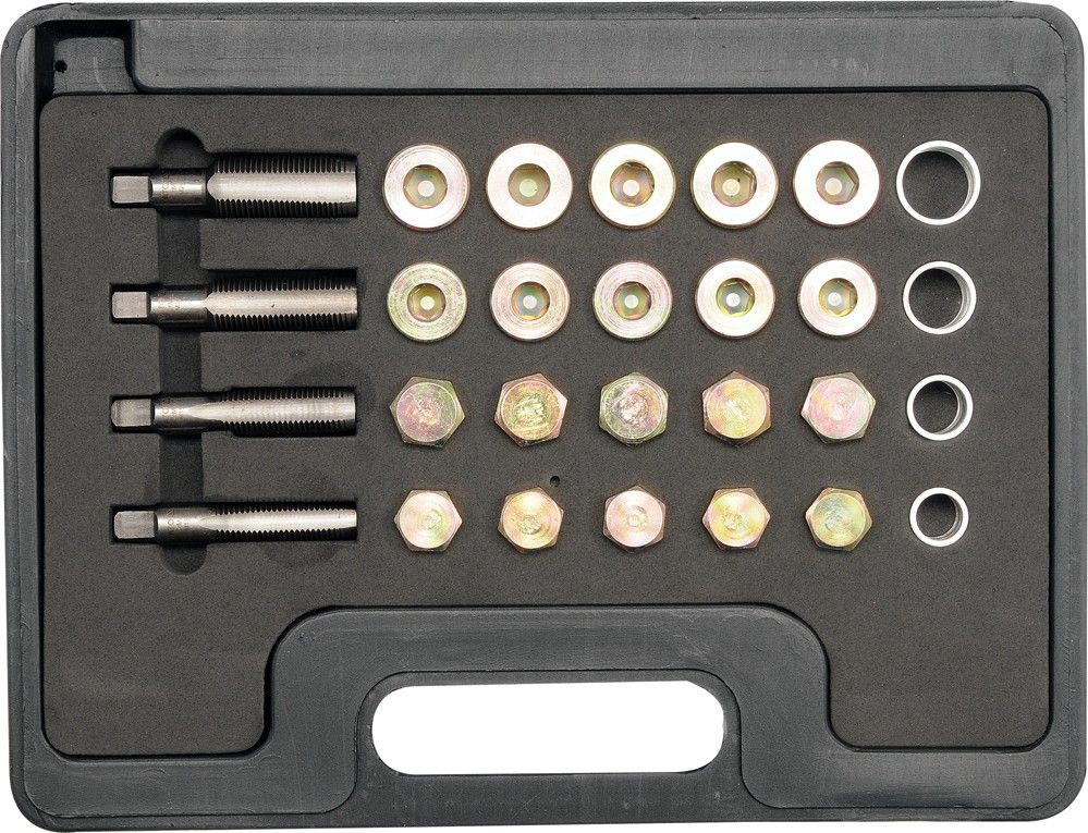 Súprava na opravu závitov vypúšťacích skrutiek olejových vaní. Súprava obsahuje opravu pre štyri typy závitu: M13, M15, M17, M20 a to jednostupňové závitníky z CrMo ocele, 5 ks skrutiek a 10 podložiek zodpovedajúcich rozmerom pre daný závit.