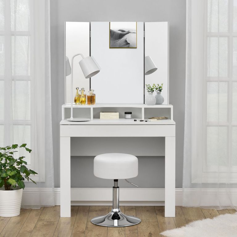 Taburet Tonia je perfektnou voľbou pre každú ženu aj dievča, ktoré hľadá štýlové a pohodlné miesto ku kozmetickému stolíku. Moderný dizajn v bielej a striebornej farbe krásne doplní každý interiér a spríjemní každodenné rituály. Pohodlný sedák z umelej kože poskytne maximálny komfort pri líčení aj relaxácii.