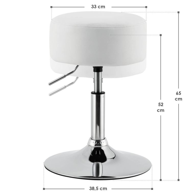 Vďaka výškovo nastaviteľnej konštrukcii si ľahko prispôsobíte výšku taburetu svojim potrebám. Stabilná kovová základňa zaisťuje bezpečné sedenie a jednoduchú údržbu - stačí utrieť vlhkou handričkou. Taburet je vhodný na každodenné použitie a unesie až 120 kg.
