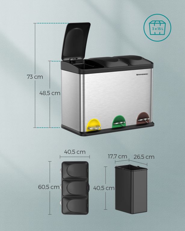 Celkový objem koša je 45 litrov, rozdelených do troch vyberateľných nádob po 15 litroch. Vďaka praktickým držadlám je vysypanie a čistenie rýchle a bezproblémové. Tesniace veká spoľahlivo bránia úniku pachov, zatiaľ čo pevná nerezová konštrukcia odoláva vlhkosti aj každodennému používaniu. Otváranie pomocou pedálov zaisťuje hygienickú obsluhu, takže sa koša nemusíte dotýkať rukami. Rozmery výrobku sú 59,3 × 30,2 × 46,7 cm a pri otvorení veka dosahuje výšku 72 cm.
