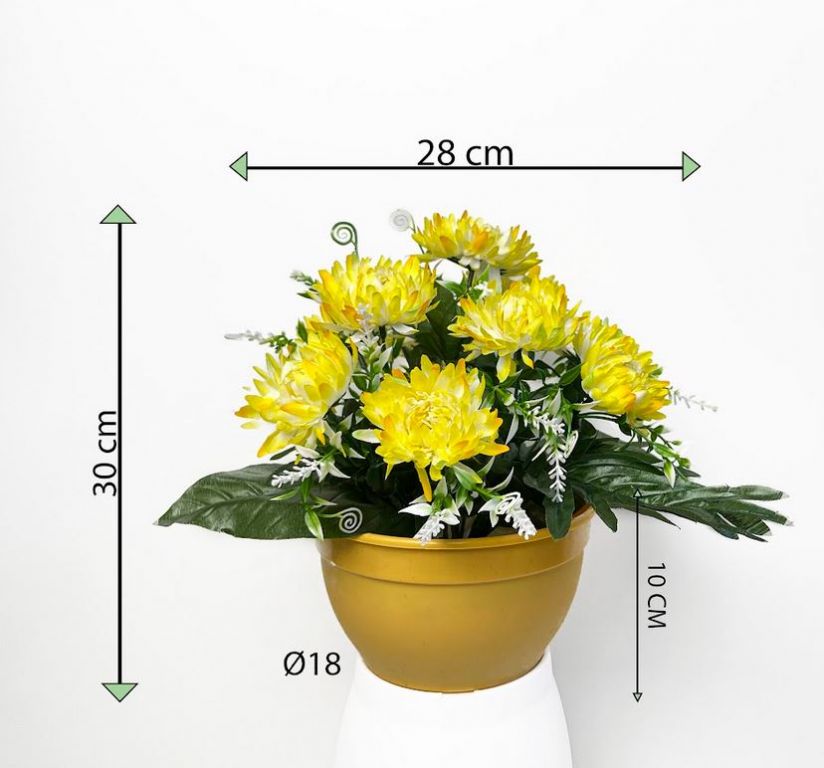 Užite si trvalú a nenáročnú dekoráciu, ktorá Vám bude robiť radosť dlhé roky. Krásna dekoratívna a bohatá kvetina s umelými kvetmi má širokú škálu využitia. Môžete si ju postaviť doma na stôl, v kancelárii, ale možno ju využiť aj ako krásnu smútočnú dekoráciu. Kvetina je v kvetináči zapustená na pevno, celá kompozícia je teda stabilná a odolná proti prevrhnutiu.