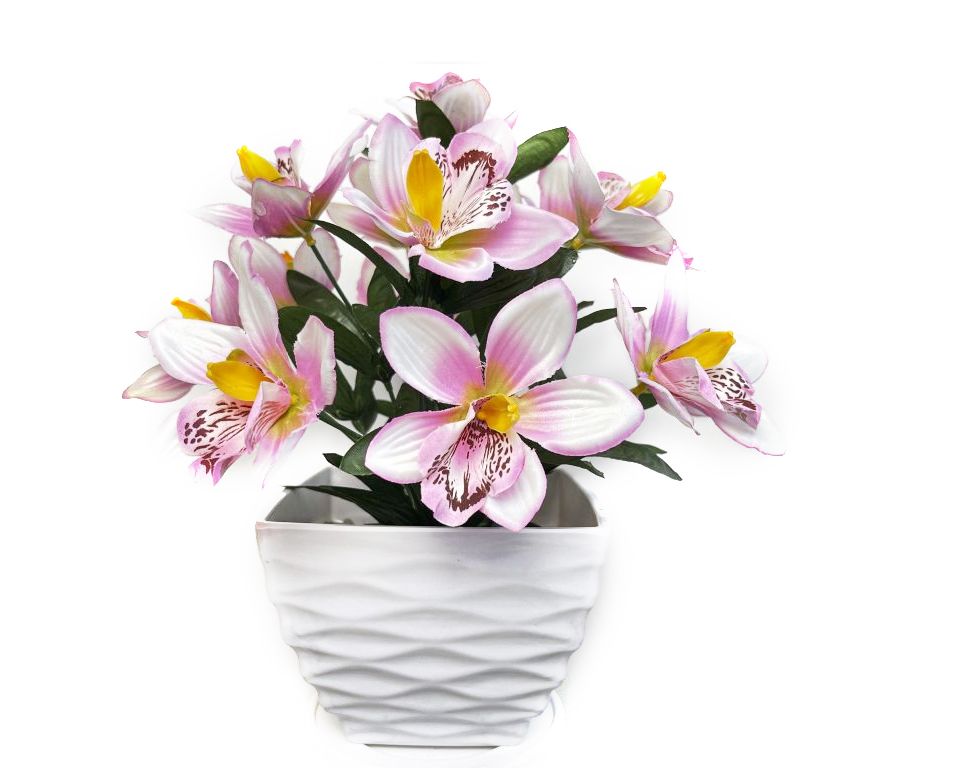 Umelá orchidea vytvarovaná a zaliata do kvetináča je v krásnej ružovo- bielej farbe. Kvetina má na výšku cca 32 cm, takže sa stane krásnym doplnkom nielen pre Váš byt, kanceláriu, obchod alebo reštauráciu.