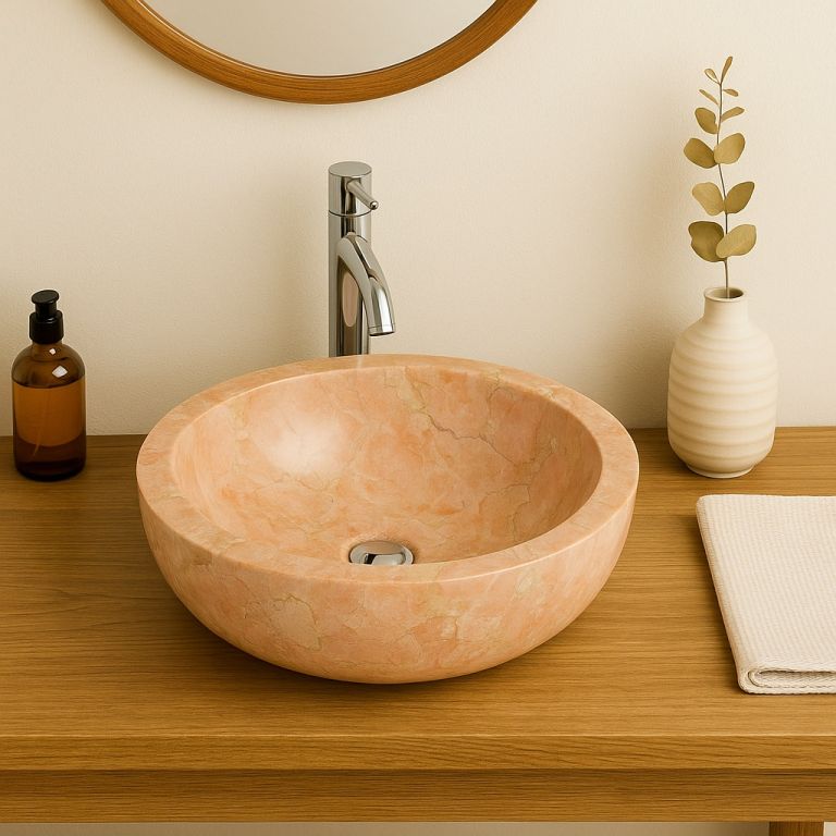 Designové umývadlo Gemma na dosku je vyrobené z jedného kusu kameňa bez lepenia. Toto luxusné kamenné umývadlo je okrúhle a ručne leštené, preto je hladké a krásne sa leskne. Hrúbka steny nie je nikdy menšia ako 3 cm. Umývadlo je tak pevné a takmer nerozbitné. Odtokové otvory sú v štandardnej európskej veľkosti.