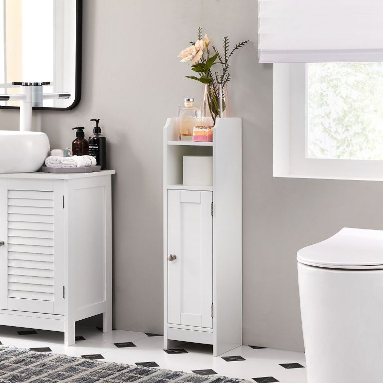 Praktická kúpeľňová skrinka VASAGLE v bielej farbe šetrí miesto, ponúka dostatok úložného priestoru a ľahko sa montuje