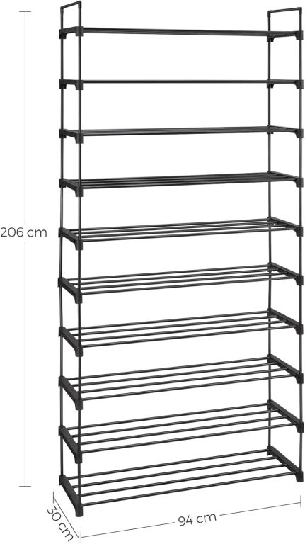 Tento vysoký botník je ideálnym riešením pre každého, kto potrebuje maximálny úložný priestor na čo najmenšej ploche. Vďaka 10 úzkym policam pojme až 50 párov topánok, pričom jeho subtílna konštrukcia ponechá vašej predsieni alebo šatni stále vzdušný vzhľad. Ľahko zapadne do moderného interiéru a vďaka univerzálnej čiernej farbe nebude pútať nežiaducu pozornosť.
