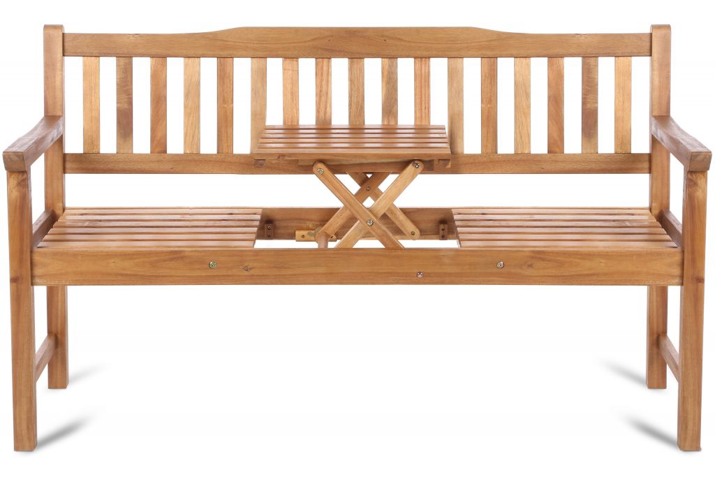Drevená záhradná lavička z exotického dreva s praktickým skladacím stolíkom. Doprajte si pohodlné posedenie vo dvoch aj s občerstvením.