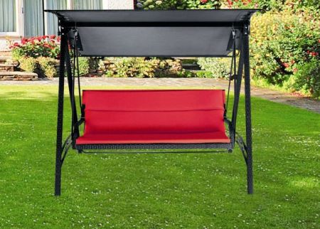 Záhradná hojdačka - kovová konštrukcia + umelý ratan + vínová poduška. Umelý ratan vyniká svojou odolnosťou proti UV žiareniu, je bezúdržbový a veľmi ľahký. Umelý ratan sa vyrába z polyetylénu, čo zaisťuje väčšiu pevnosť, stálofarebnosť a celkovú životnosť materiálu. Nábytok z ratanu je navyše podstatne ľahší ako nábytok z dreva.