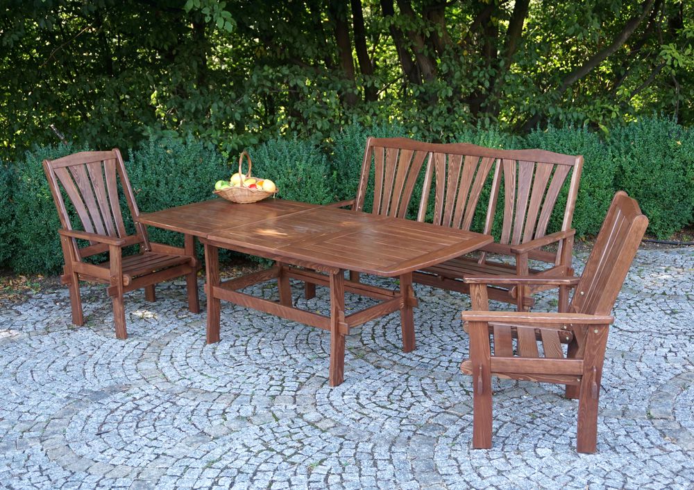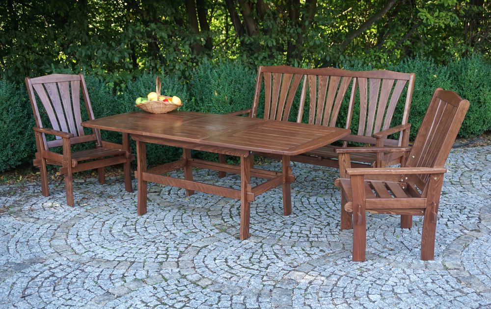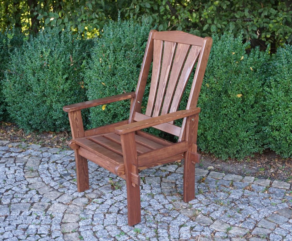 Záhradné kreslo z borovicového dreva, ktoré je impregnované a lakované.