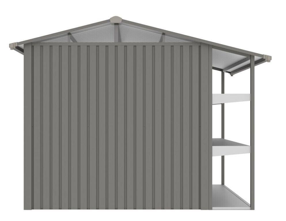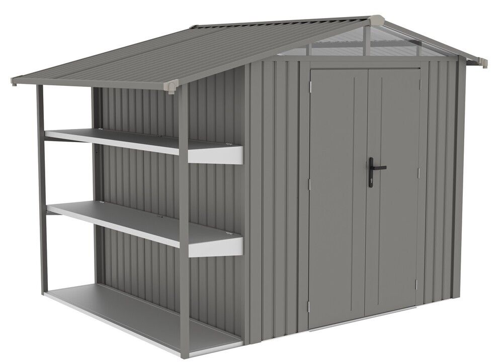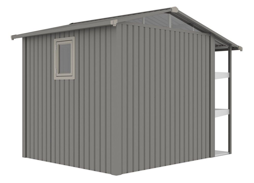 Záhradný plechový domček AMY X-B s regálmi a oknom, sivý