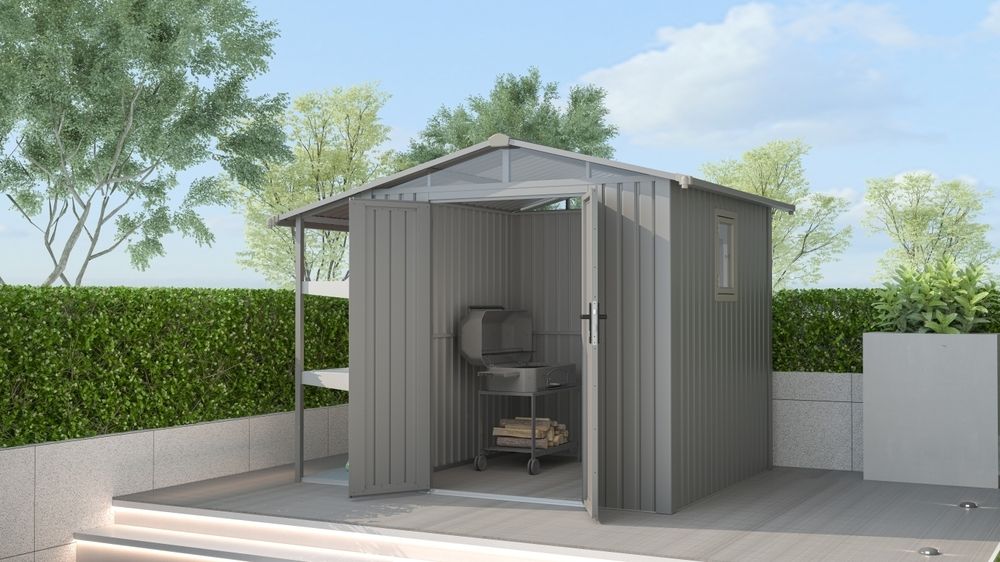 Konštrukcia z pozinkovanej ocele zabezpečuje maximálnu odolnosť voči poveternostným vplyvom. Montáž je jednoduchá a vďaka systému na odvod dažďovej vody zostane všetko v suchu. Uzamykateľné dvere chránia vaše veci pred krádežou a vysoké steny poskytujú dostatok priestoru aj pre vyšších užívateľov.