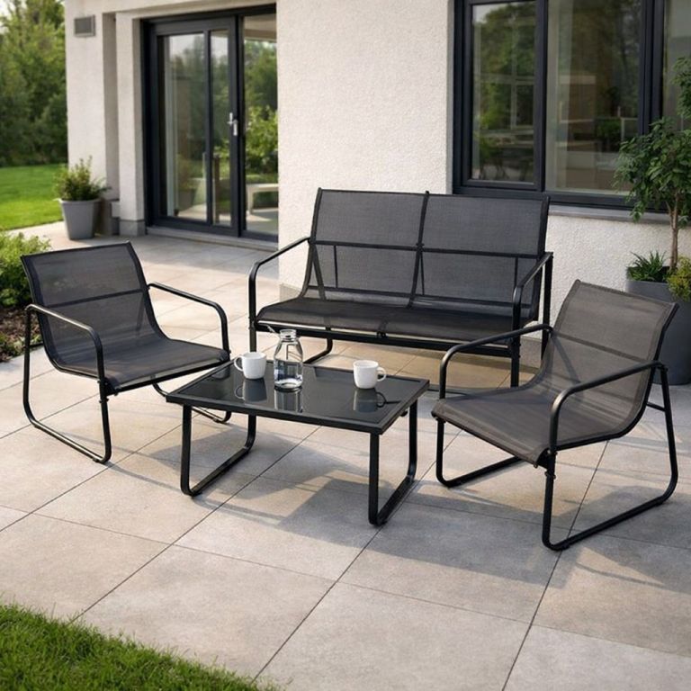 Tento záhradný set sa skladá z dvoch kresiel, pohovky a stola s priesvitnou sklenenou doskou. Táto kombinácia je preto ideálna pre pohostinné raňajky, večeru alebo posedenie s celou rodinou na vašej záhrade, balkóne alebo terase. Nábytok vyrobený v kombinácii oceľ-textil sa vyznačuje elegantným vzhľadom a praktickou funkčnosťou. Každá stolička je vyrobená zo šedej lakovanej ocele a nabáda k pohodlnému sedeniu. Sedák a operadlo stoličiek tvorí čierny elastický poťah s textíliou odolnou voči poveternostným vplyvom. Jedná sa o ľahkú, robustnú plastovú tkaninu, ktorá sa ľahko udržuje a odolá mnohým poveternostným vplyvom. Sklenený stôl je veľmi stabilný, ľahko sa čistí a má dosku z priesvitného bezpečnostného skla. Zaoblené, zakrivené nohy robia stôl vizuálne zaujímavým. Robustný rám stola je taktiež vyrobený z ocele a má povrchovú úpravu v sivom laku.