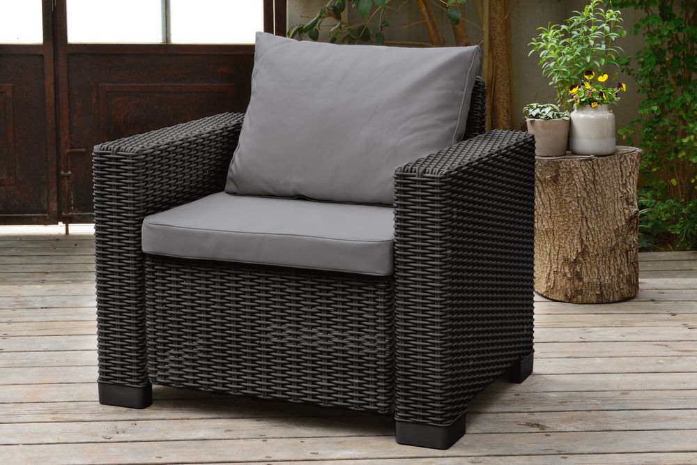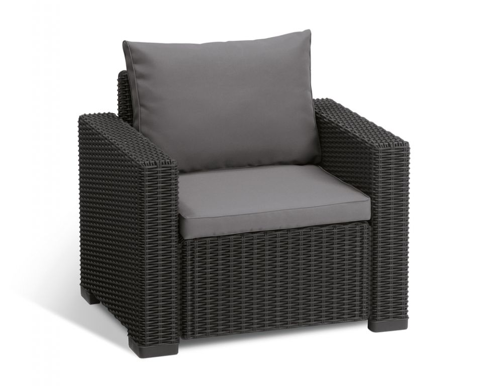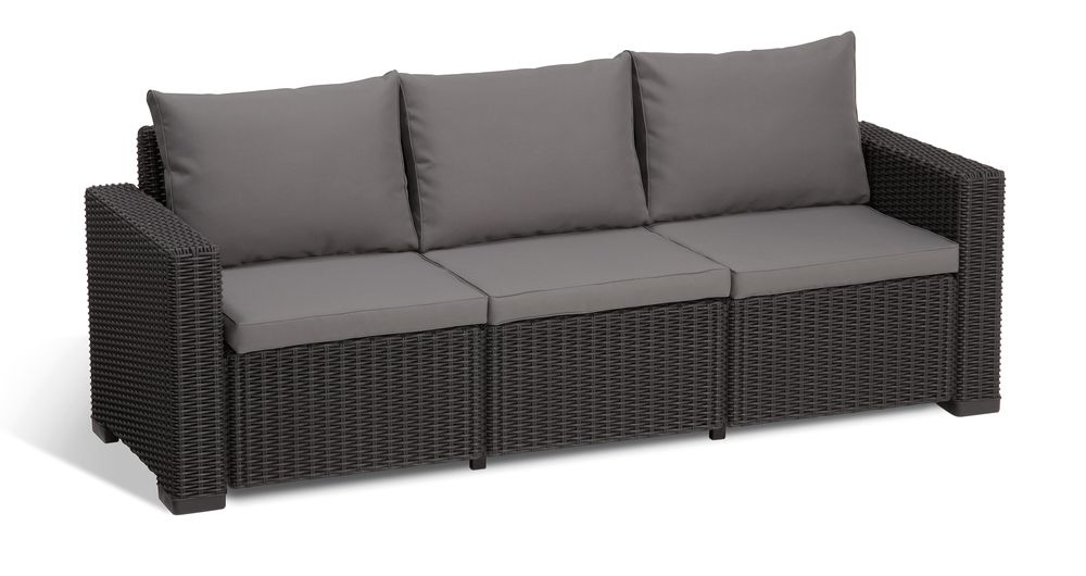 California je pohodlné a moderné posedenie vhodné do exteriéru aj interiéru. Súprava je vyrobená z lisovaného plastu v imitácii guľatého ratanu. Set je doplnený o podušky, ktoré zaistia ešte väčšie pohodlie. Skladá sa z dvoch kresielok, sofa pre 3 osoby a stolíka. Jednoduchá montáž aj údržba. Set je odolný voči nepriaznivému počasiu a UV žiareniu.