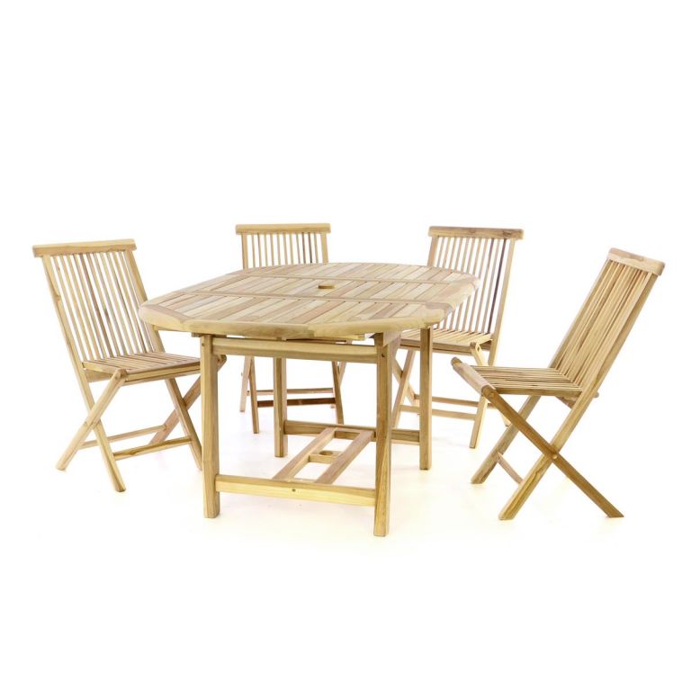 Exkluzívna 5-dielna zostava záhradného nábytku DIVERO sa skladá zo 4 masívnych stoličiek s vysokou opierkou a oválneho rozťahovateľného stola. Predĺženie stola je možné vďaka hliníkovej klznej lište. Štyri skladacie stoličky sú postavené behom okamihu a vďaka zaobleným hranám a úzkym lištám sú aj bez sedákov veľmi pohodlné.