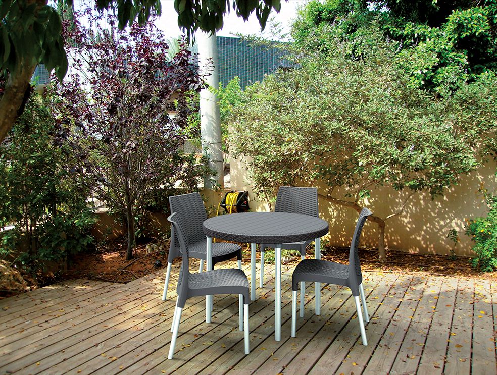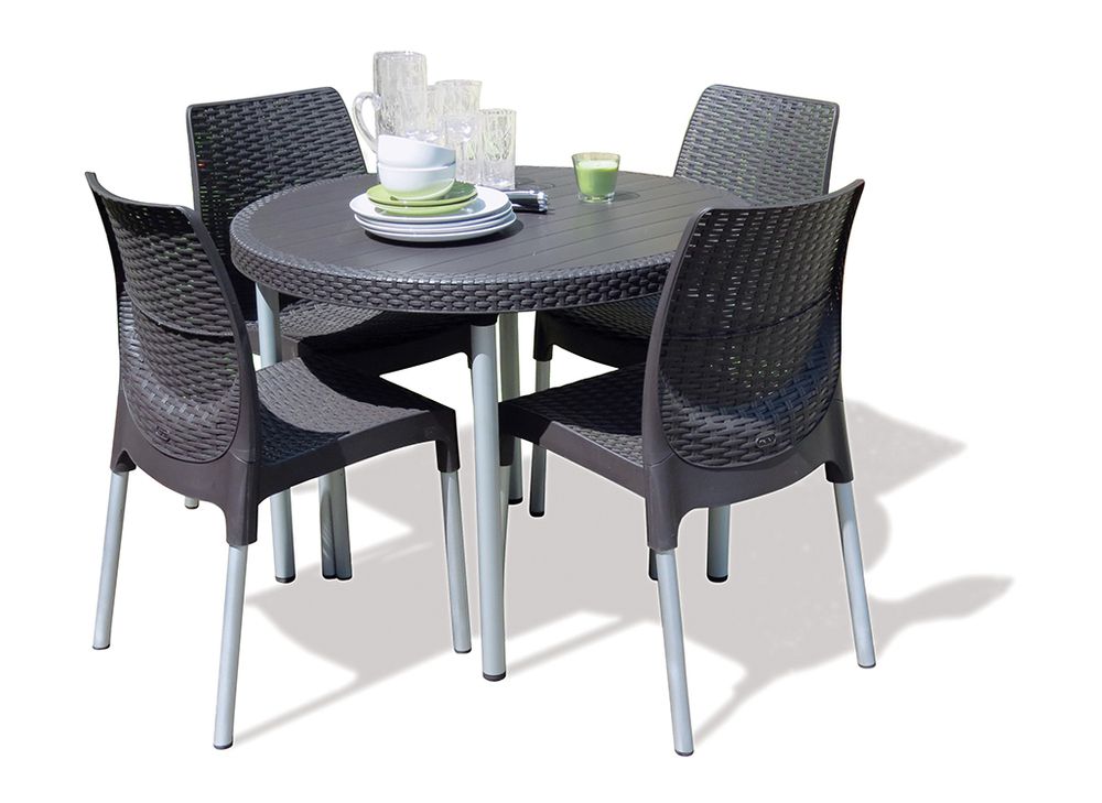Záhradný set z plastu (imitácia ratanu) vhodný ako posedenie na záhradu alebo terasu.