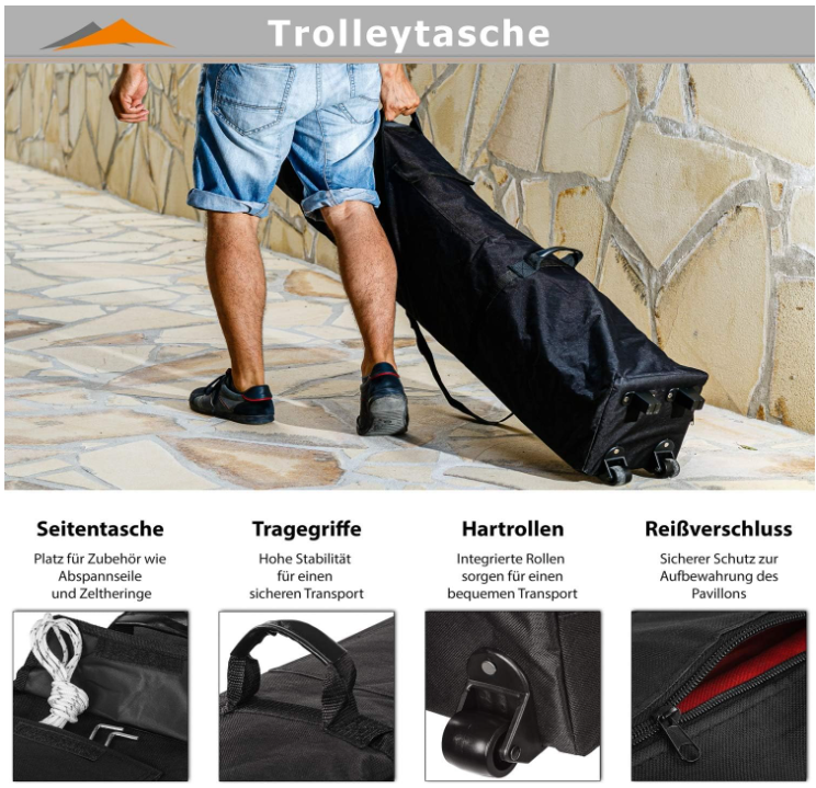 Stabilná oceľová konštrukcia a kvalitná polyesterová strecha s PVC vrstvou zaručujú dlhú životnosť a jednoduchú údržbu. Výškovo nastaviteľné nohy a praktická taška na kolieskach umožňujú jednoduché prenášanie aj skladovanie stanu.