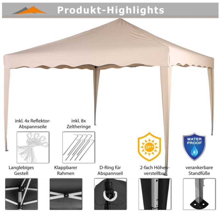 Náš skladací pavilón INSTENT „Basic“ má rozmery strechy a postaveného pavilónu 3 x 3 m a je výškovo nastaviteľný.