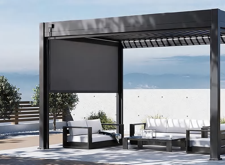 Praktická zástena s textilenom, chráni pred vetrom, kompatibilná s bioklimatickými pergolami.